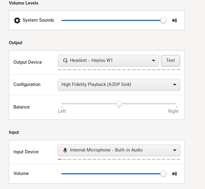 قبلا در اوبونتو با تغییر Configuration در قسمت Output از Headset Head Unit (HSP/HFP) به High Fidelity Playback (A2DP‌ Sink) گزینه Haylou W1 در قسمت Input هم ظاهر می شد اما در دبیان هدفون را به عنوان Input نمی شناسد.