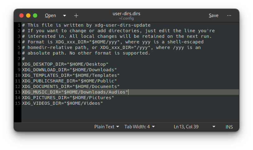 home/.configو فایل user-dirs.dirs رو با دوبار کلیک باز کردم و تغییر لازم رو دادم (برای تست فقط بخش download رو تغییر دادم)