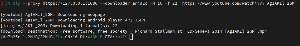 yt-dlp --proxy https://127.0.0.1:1080 --downloader aria2c -N 16 -f 22  https://www.youtube.com/watch\?v\=Ag1AKIl_2GM